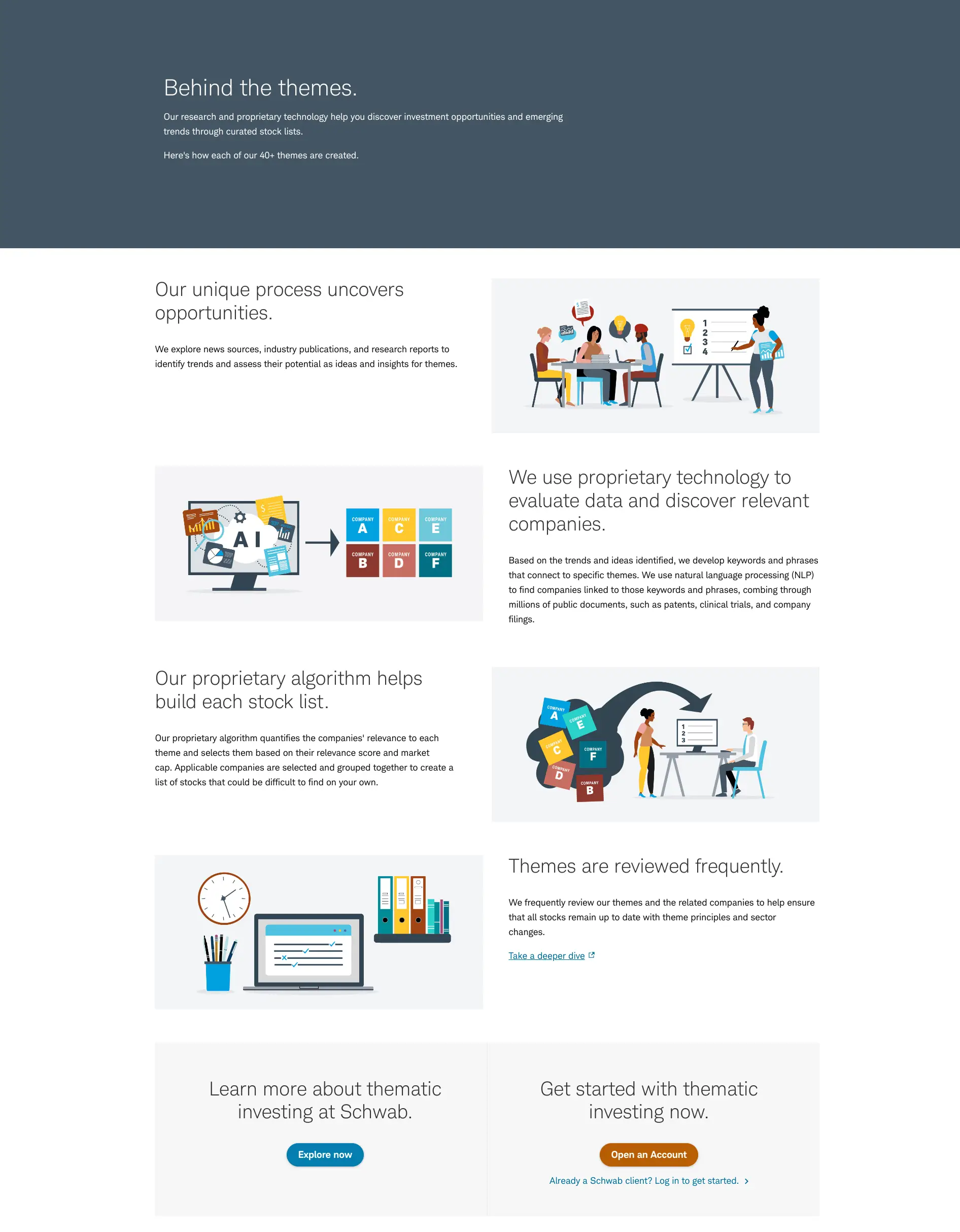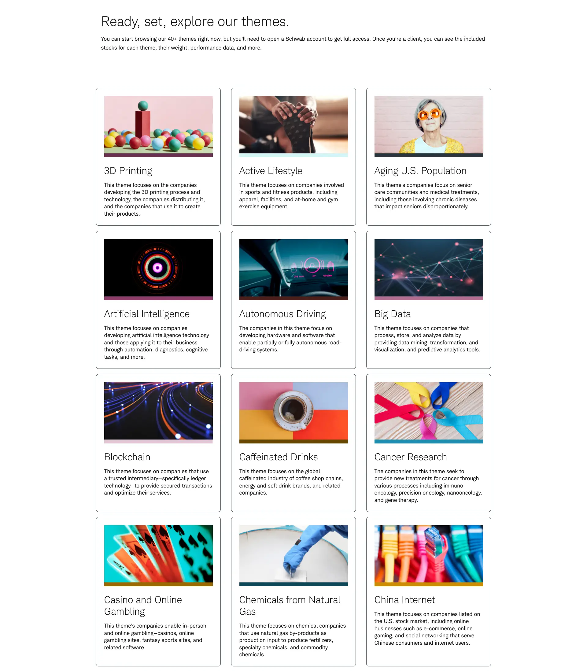 To make investing more accessible and personalized, we brought our winning new business pitch for Schwab’s Investing Themes product to life — highlighting how thematic investing empowers clients to align their financial goals with their passions, interests, values, and emerging trends.