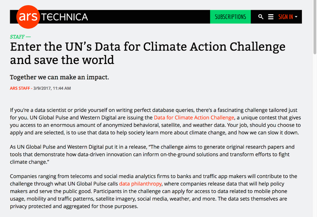 We launched a year-long campaign showcasing "data philanthropy" — the concept of donating data for public research to fuel actionable climate solutions. Partnering with the United Nations, we hosted a data innovation challenge supporting the UN's Sustainable Development Goals.